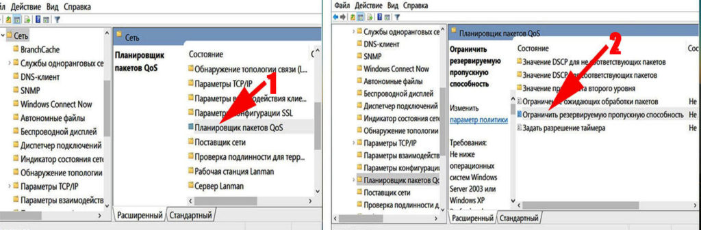 - Следуем по пути: Конфигурация -> Административные шаблоны -> Сеть -> Планирование пакетов QoS.