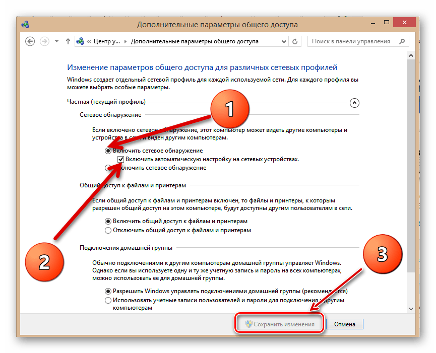 В свойствах текущего профиля включаем сетевое обнаружение и автоматическую настройку на сетевых устройствах. Для этого ставим галочки в соответствующих полях. Жмём на значок «Сохранить изменения», перезагружаем компьютер и пользуемся технологией UPnP в полной мере.