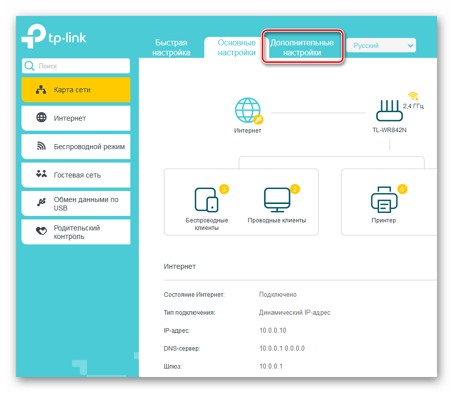Попав на главную страницу веб-интерфейса вашего роутера, в первую очередь перемещаемся на вкладку «Дополнительные настройки», где мы обязательно найдём нужные нам параметры.