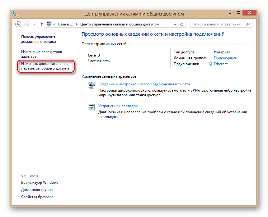 - Через закладку Выбор параметров общего доступа и домашней сети — включить или отключить на ПК ;