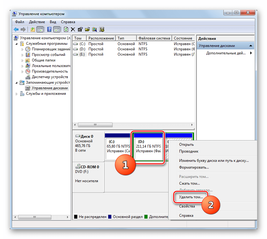- Удаление диска D и расширение диска С за счёт освободившегося пространства.