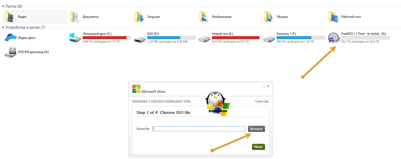 Обратите внимание, что у меня есть USB флешка, диск G:\. Она не пустая на текущий момент, на ней записал FreeDos, На первом окне мастера, вам необходимо указать путь до вашего ISO файла, делается это через кнопку «Browse»