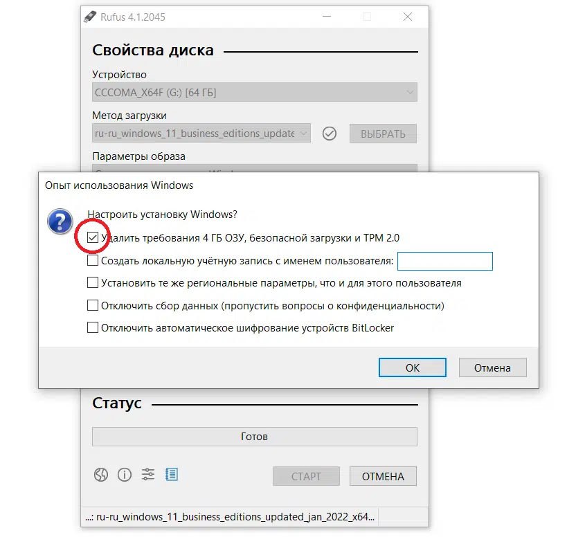 Как только вы выберите образ Windows 11, у вас появится раздел “Параметры образа”, где вам следует выбрать вариант “Extended Windows 11 Installation (no TPM/no Secure Boot)”. Затем нажимаем “Старт” и ждём завершения установки.