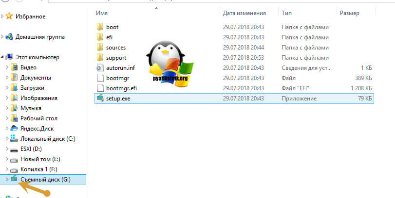 Если вы откроете содержимое вашей флешки в проводнике Windows, то увидите вот такую структуру файлов и папок. Ваш загрузочный USB, получит новый ярлык и вот такое содержимое. Теперь вы можете выставить в BIOS нужный порядок загрузки и производить установку Windows 10 с вашей флешки.