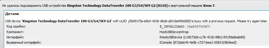 Если в верхней части экрана VirtualBox при попытке пристегнуть флешку постоянно появляется сообщение на английском с окончанием usb device is busy with previous request, решение ошибки может лежать в части валидности самой программы. И здесь вариантов немного, хотя симптомов фоне ошибки море. Если usb device is busy with previous request появляется при подключении любой из флешек, проверьте Диспетчер устройств хозяйской машины.
