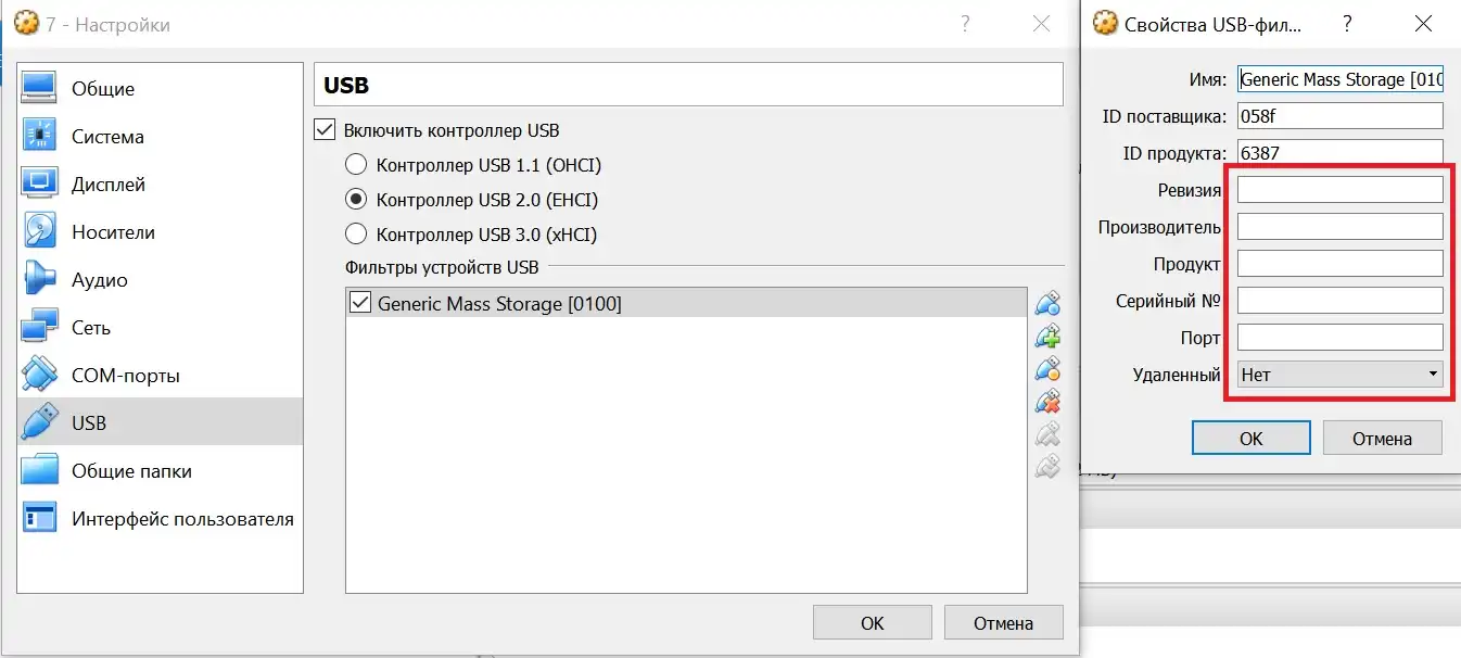 Жмём ОК. По сути, если вы добавили специальный фильтр, ничего, кроме Имени и двух ID VirtualBox-у, вообще не нужно, чтобы правильно идентифицировать флешку. Однако иногда настройки фильтра нуждаются в более тщательном подходе. Например, на некоторых виртуальных машинах мой фильтр для конкретной флешки в настройках выглядит так:
