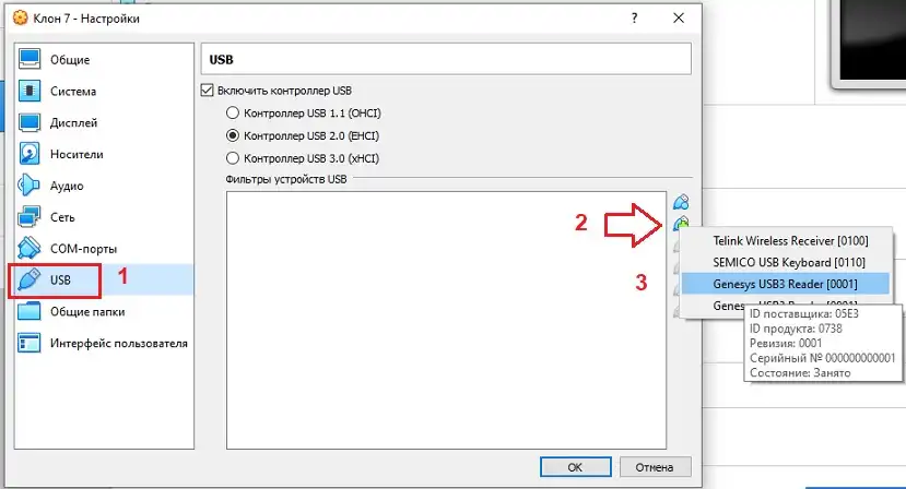 После его установки вы сможете выбрать USB 2.0 или 3.0 без ошибок, но при этом в настройках вам нужно будет добавить флешку в список USB -фильтров нажатием кнопки в виде плюсика.