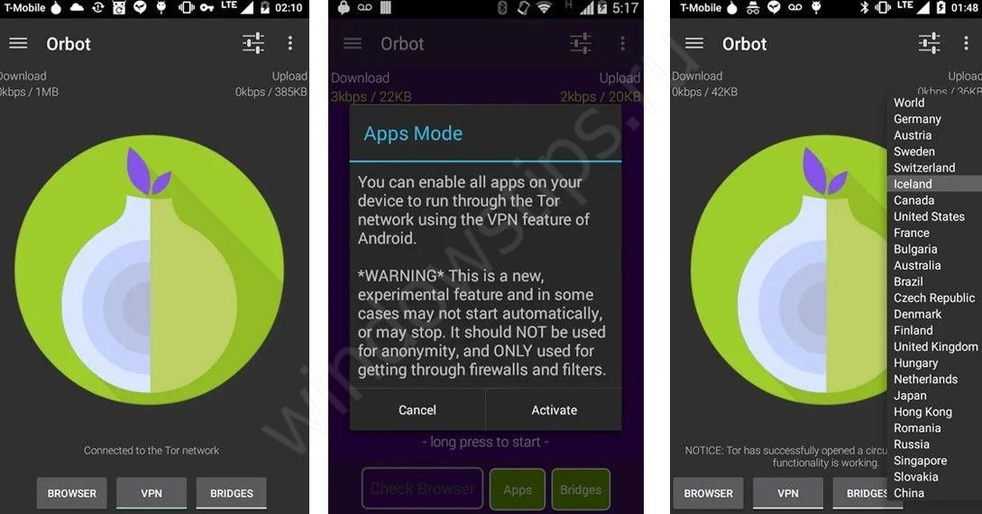 Для включения необходимо скачать мобильный браузер с VPN для Андроид на Гугл Плей, запустить программу и нажать на кнопку Соединение. В каких-то дополнительных действиях нет необходимости. После подключения IP на посещаемых сайтах будет меняться в автоматическом режиме.
