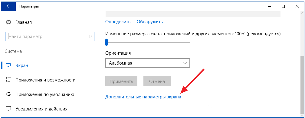 Откроется окно, в котором нужно нажать «Дополнительные параметры экрана», чтобы перейти в настройки разрешения дисплея;