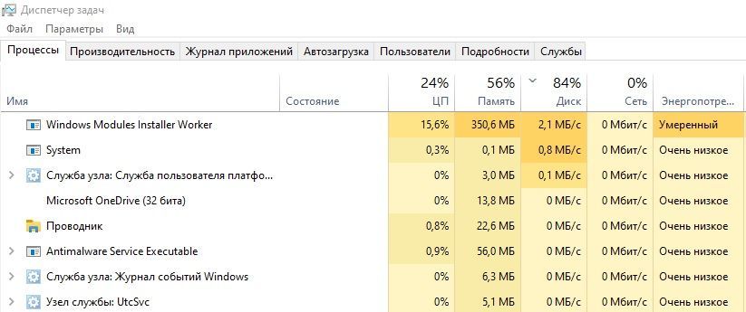 Нередко случается, что появившаяся ниоткуда высокая нагрузка вызвана процессами, так или иначе связанными с обновлениями. Windows Modules Installer Worker, она же WMIW, она же TiWorker.exe занимается поиском обновлений на серверах Windows и установкой оных в систему. Просто перезагрузка редко решает проблему, а она сама по себе не исчезнет. По моему опыту и сведениям от других, независимо от характеристик системы, такая нагрузка может занимать до 15-20 минут. Но не более, и уж точно не от сеанса к сеансу с завидной регулярностью.
