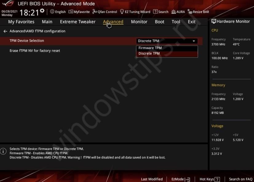 - Найдите в БИОС раздел Advanced, а там TPM Device Selection или что-то вроде этого (название может отличаться).