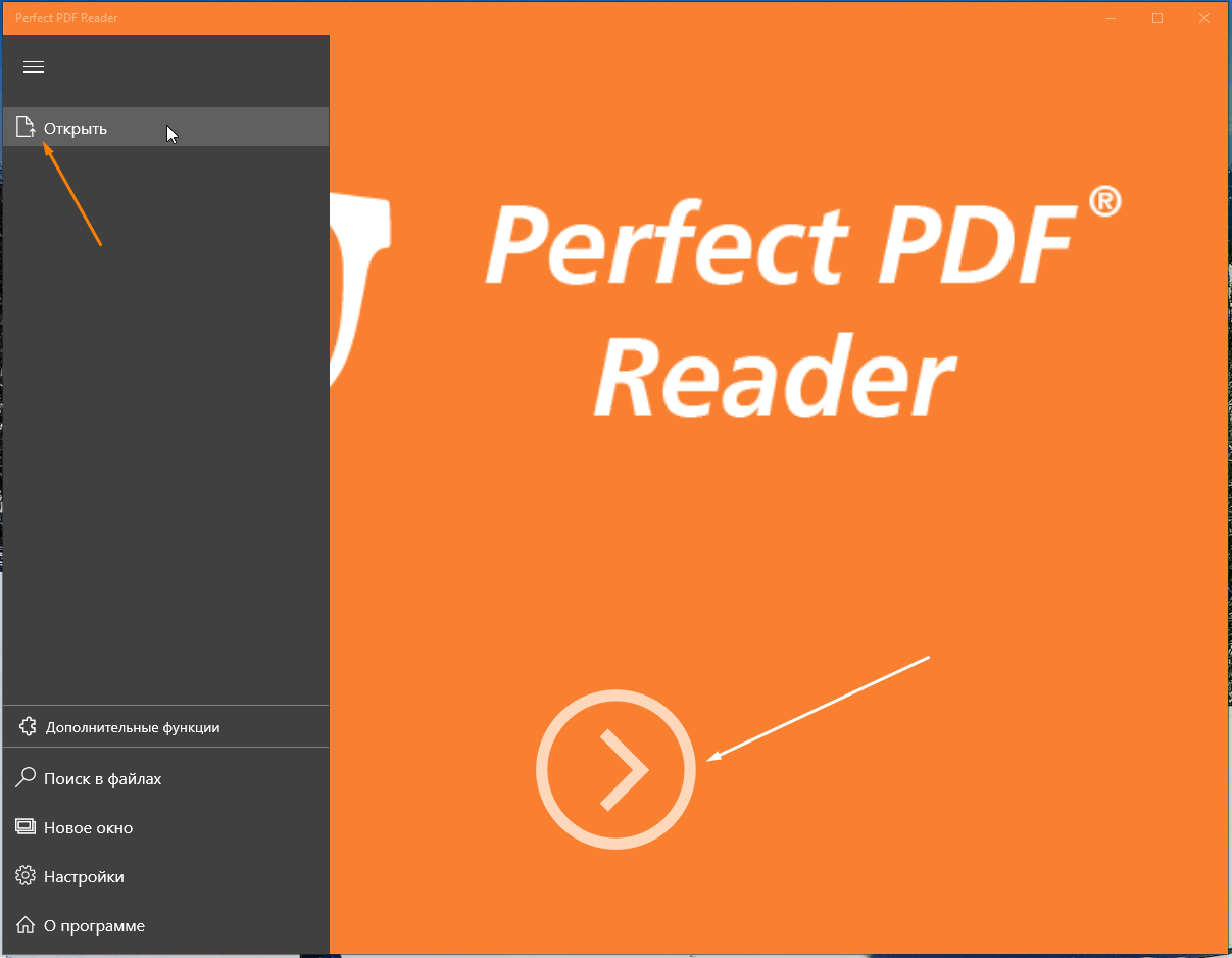 - В окне программы «Perfect PDF Reader» кликаем на стрелку в кружке, а затем на появившейся слева панели выбираем команду «Открыть».