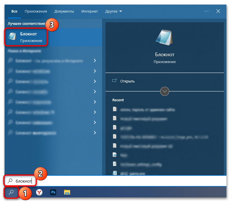 - Запустите встроенный «Блокнот», отыскав его через строку системного поиска.