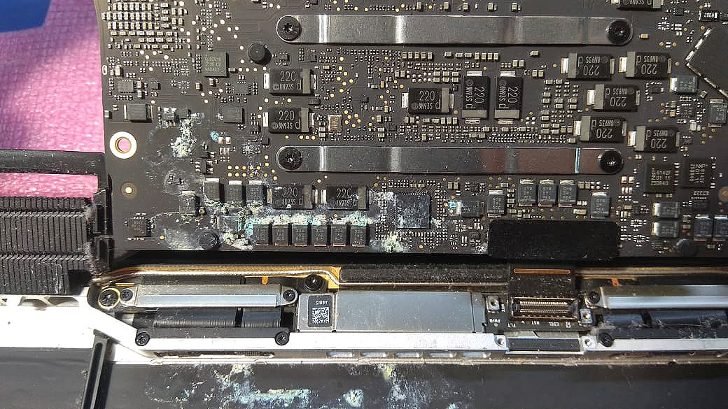Окислившаяся материнская плата и подсветка после попадания воды и использования макбука