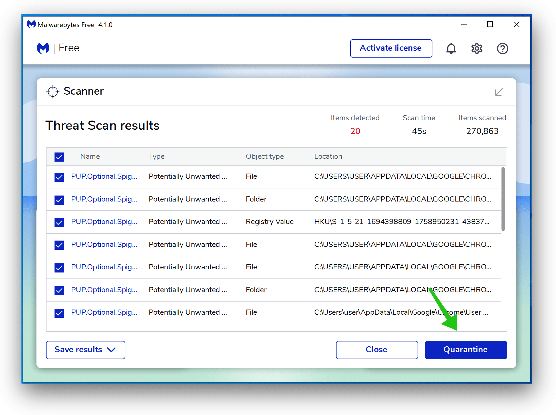 Большинство отзывов отмечают высокий уровень обнаружения вредоносных программ на компьютере и их эффективное удаление даже в бесплатной версии. После сканирования найденные угрозы по умолчанию помещаются в карантин, после чего их можно удалить, перейдя в соответствующую часть программы. При желании вы можете исключить угрозы, а не помещать их в карантин/удалять.