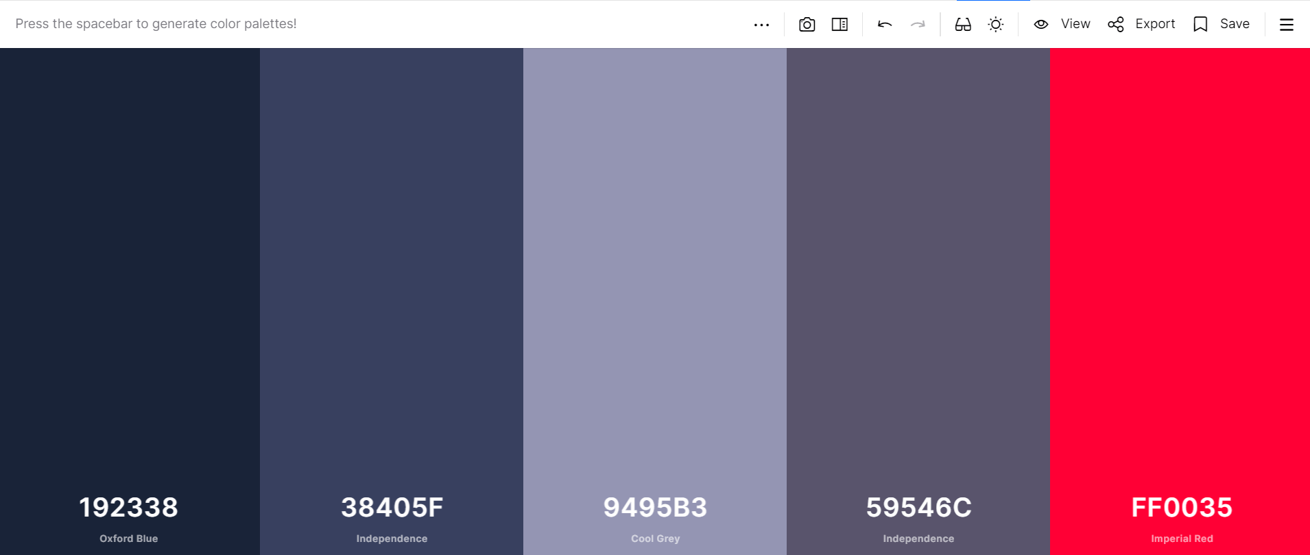 Coolors — генератор цветовых схем для дизайнеров, можно подбирать сочетающиеся оттенки и копировать коды цвета.
