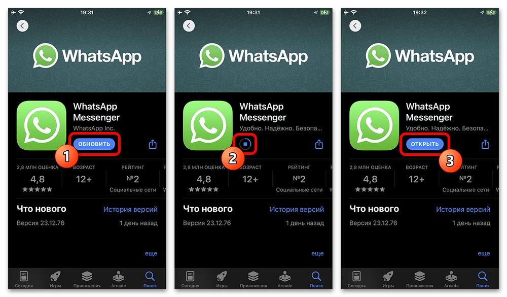 Последнее, что может быть причиной возникновения ошибок загрузки в Ватсапе, это сбои в работе мобильного приложения или использование устаревшей версии. Для начала в качестве решения следует посетить страницу программы в магазине приложений, будь то Google Play Маркет или AppStore, и по возможности установить последнюю вышедшую версию клиента, не забывая, что мессенджер не работает на старых версиях ОС.