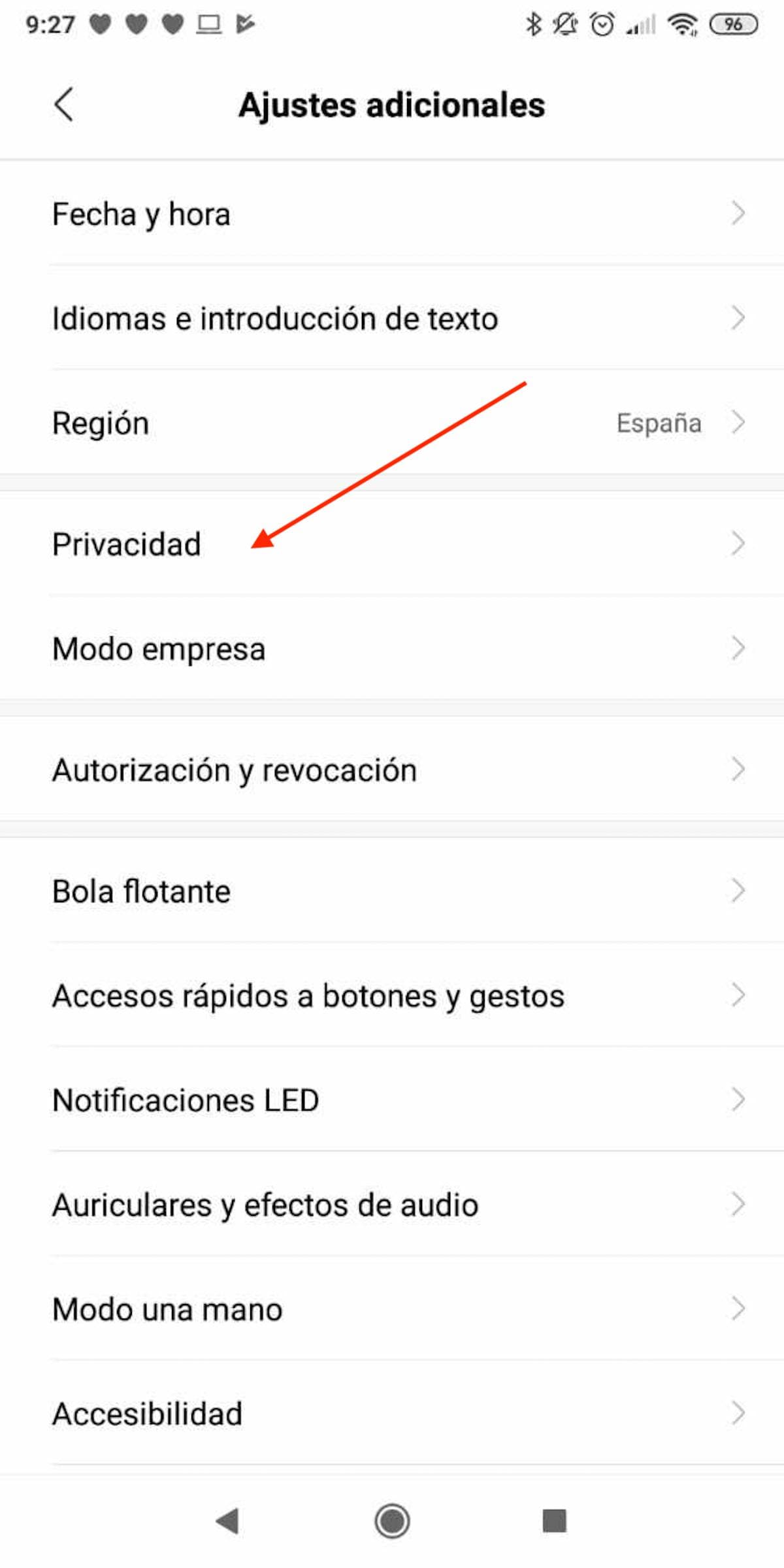 Затем мы нажмем на раздел «Конфиденциальность», и появится ряд параметров, аналогичных тем, которые мы видим ниже в этом абзаце (они могут различаться в зависимости от версии MIUI):