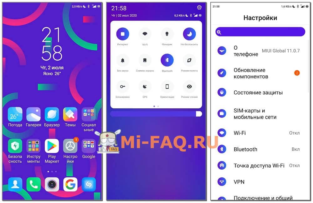Темная тема с изображением кота. Подойдет тем, кто не любит однотонные черные обои. Главная фишка данной заставки – большие и четкие иконки, выполненные в градиентном фиолетовом цвете. Строка состояния, меню настроек и звонилка перекрашены в темный цвет с малиновыми элементами. Виджет часов и даты стандартный. Кстати, здесь вы узнаете, как включить системную темную тему на MIUI 11.