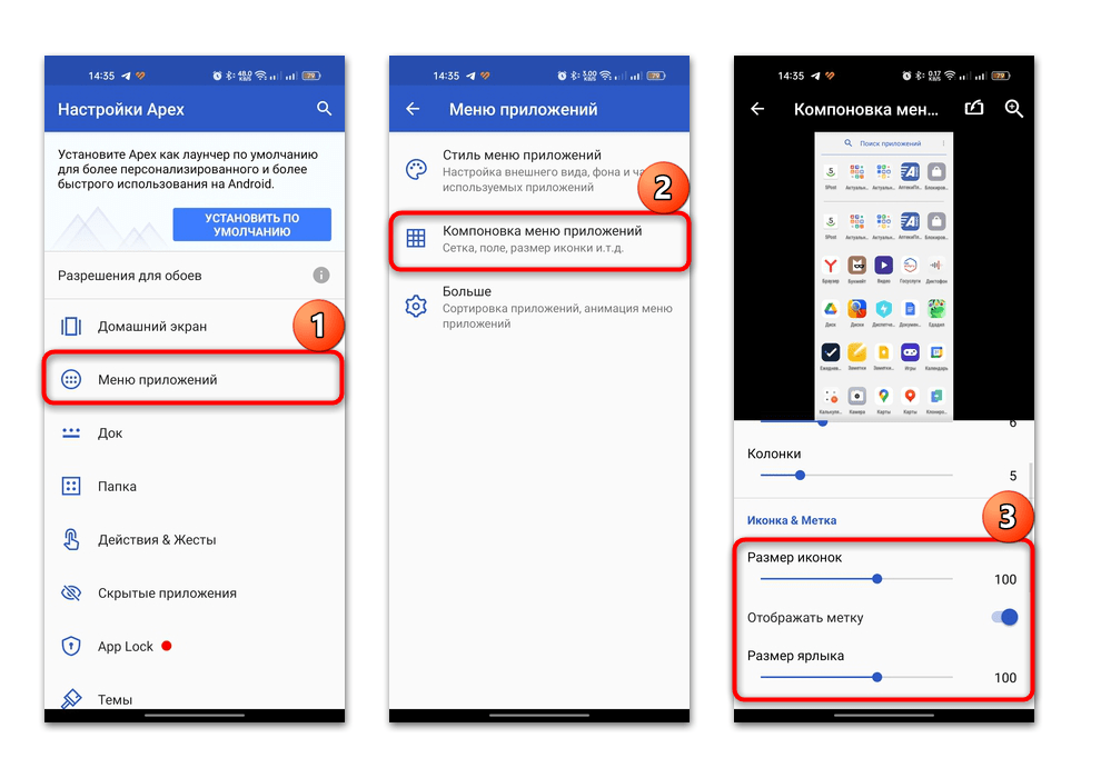 - Значки в главном меню настраиваются через раздел «Меню приложений»: как на рабочем столе или задать свое значение.