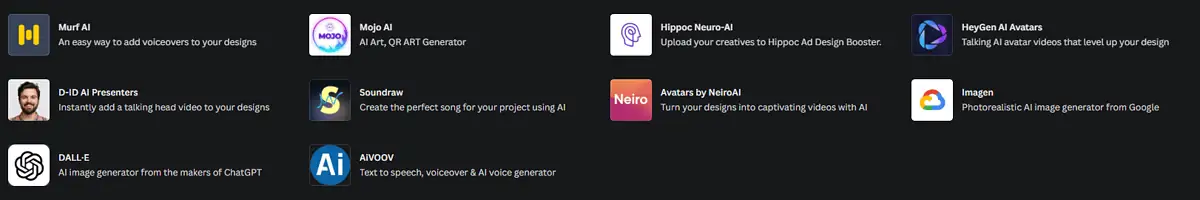 Ниже приведены инструменты искусственного интеллекта, предлагаемые Canva, охватывающий все, от AI Presenter, создания текста в изображение и даже интеграции DALL-e. Все, что вам нужно сделать, это щелкнуть соответствующую функцию, чтобы добавить ее в существующий или новый проект.