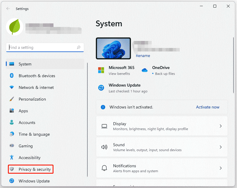 Step 2: On the Windows 11 Settings window, choose the Privacy & security setting on the left side.