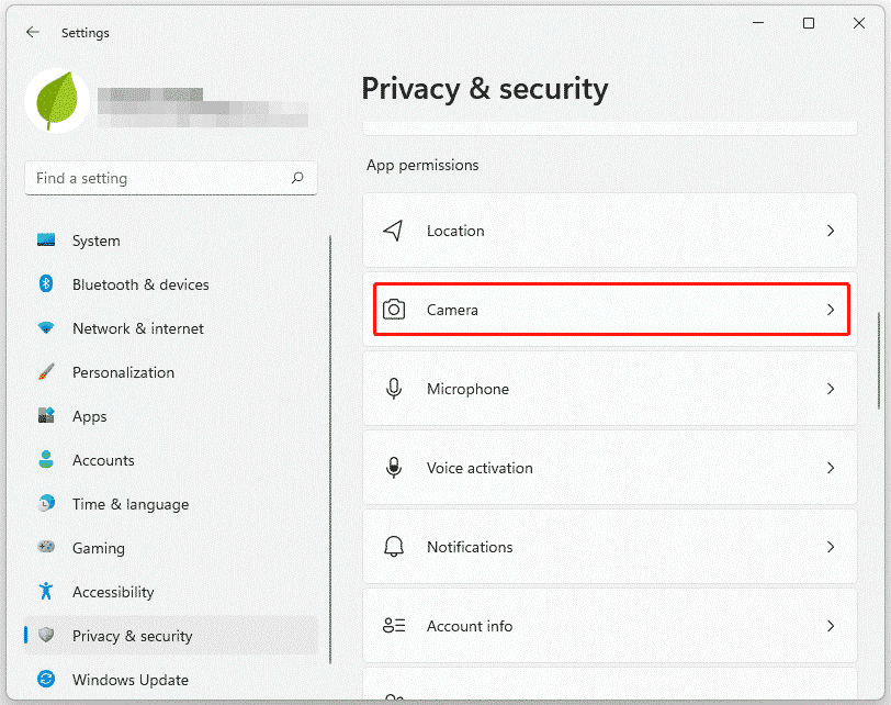 Step 3: Scroll down the right side of the window to the App permissions part. Then, find the Camera option and click it.