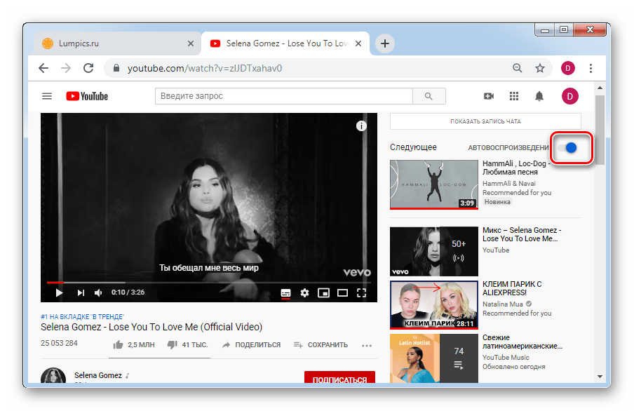 - На странице с видео в правой части найдите строку «Автовоспроизведение» и кликните на кнопку в виде ползунка, чтобы деактивировать функцию. Теперь перехода на страницу следующего видео с его воспроизведением не будет.