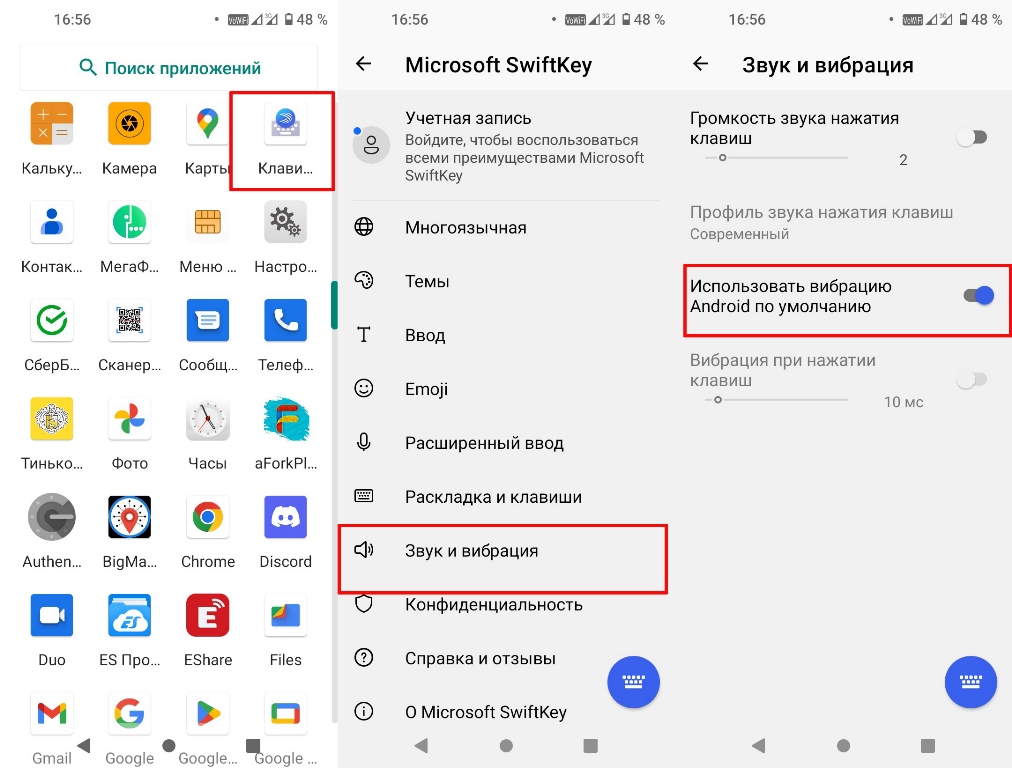 Во многих марках используется SwiftKey. Чтобы отключить вибрацию на клавиатуре при клавишном нажатии, текстовом вводе, нужно выполнить следующие действия: