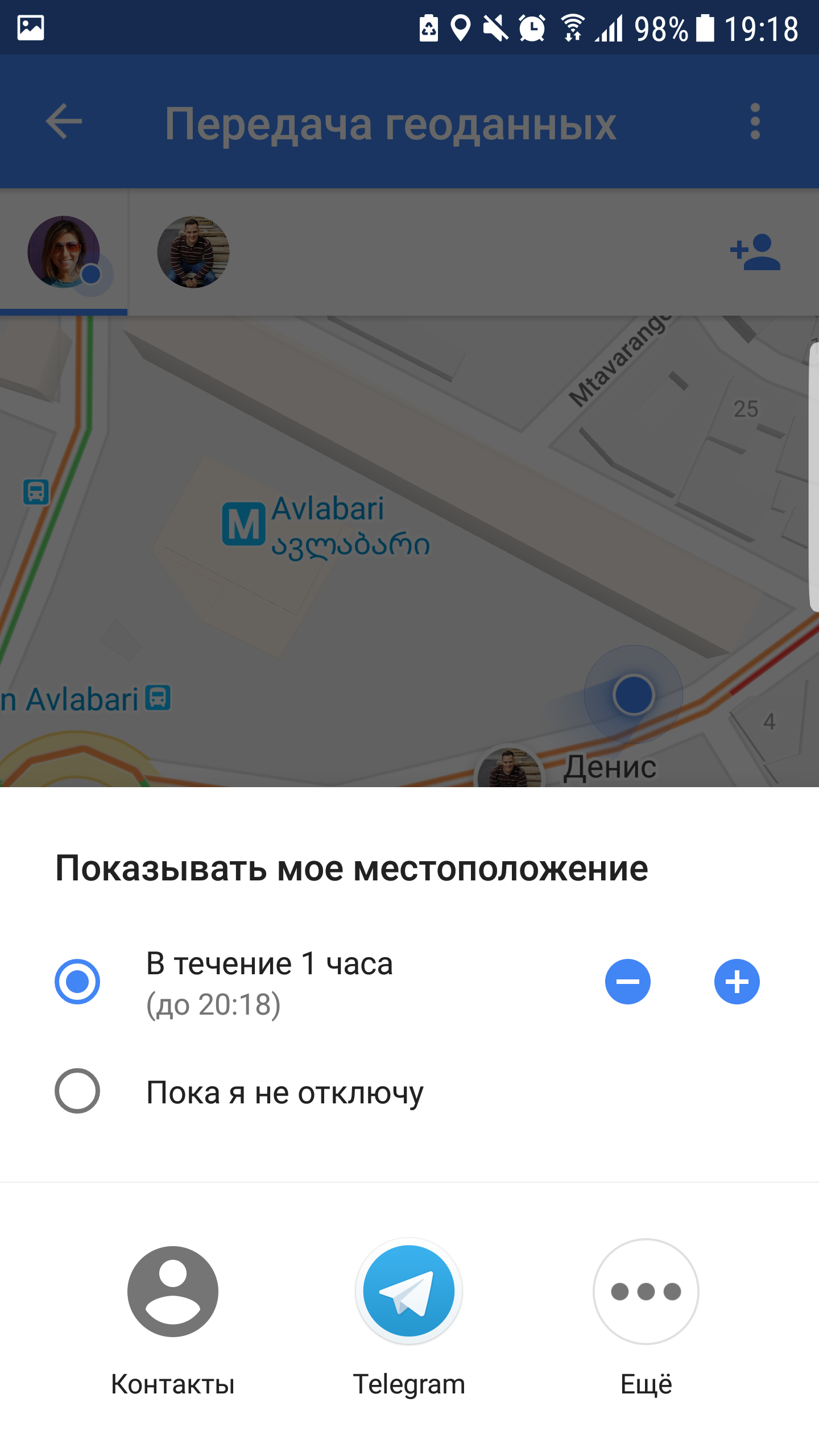 - Выбираем время, на которые вы хотите показывать своё местоположение (в течение 1 часа, в течение 1 дня и т.д.) или вообще «Пока я не отключу». У меня выбрано «Пока я не отключу», так что Денис будет видеть моё местоположение на карте Google, пока я сама не отключу эту функцию.