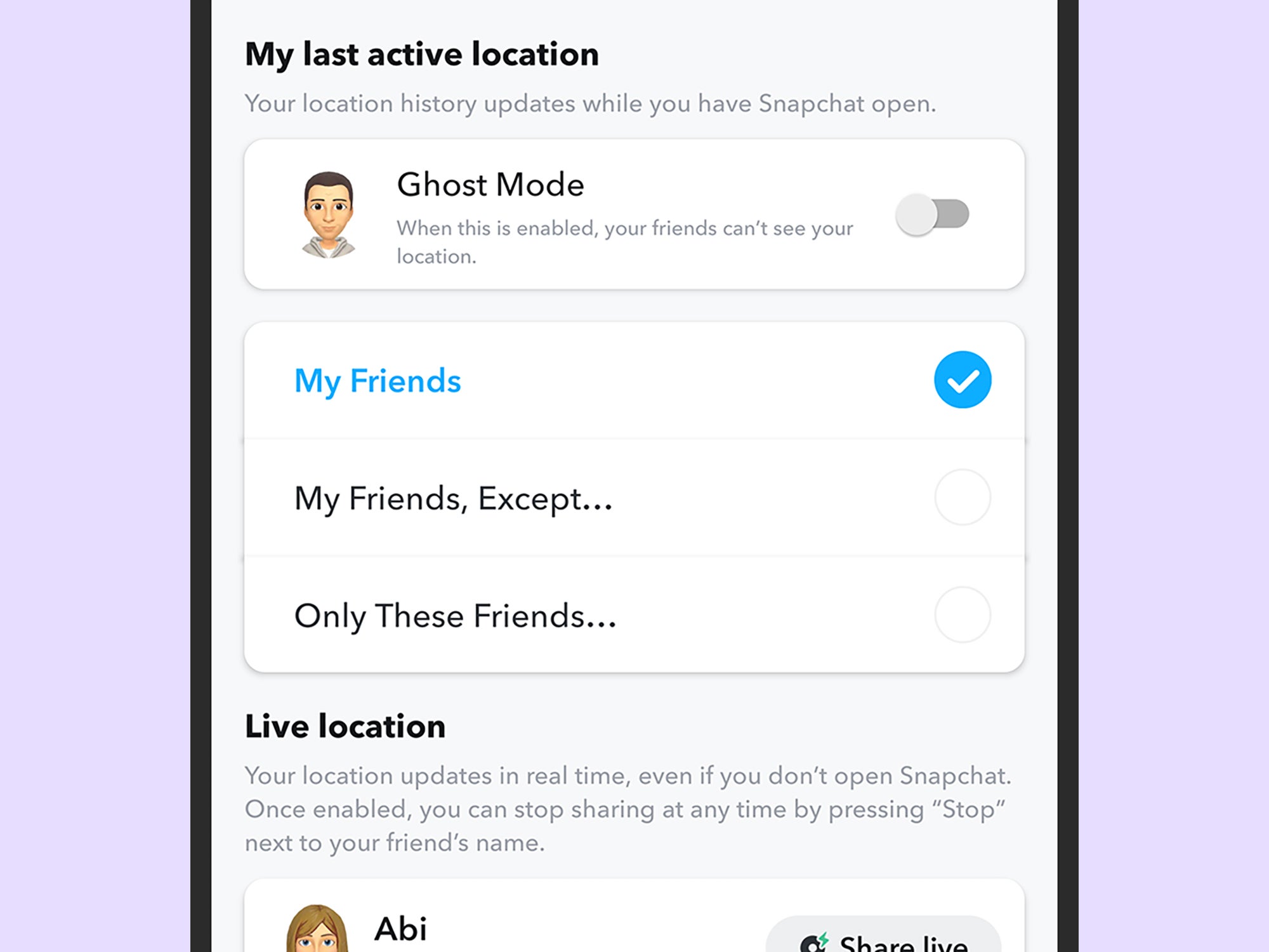 На этом же экране также есть Поделиться в прямом эфире Опция: это дает определенным друзьям возможность видеть, где вы находитесь в режиме реального времени, и вы можете включить ее на один час, восемь часов или до тех пор, пока не выключите ее. Это полезный дополнительный уровень обмена информацией о местоположении, который вы можете включить для людей, которым вы доверяете больше всего, например для вашего партнера или ваших детей.