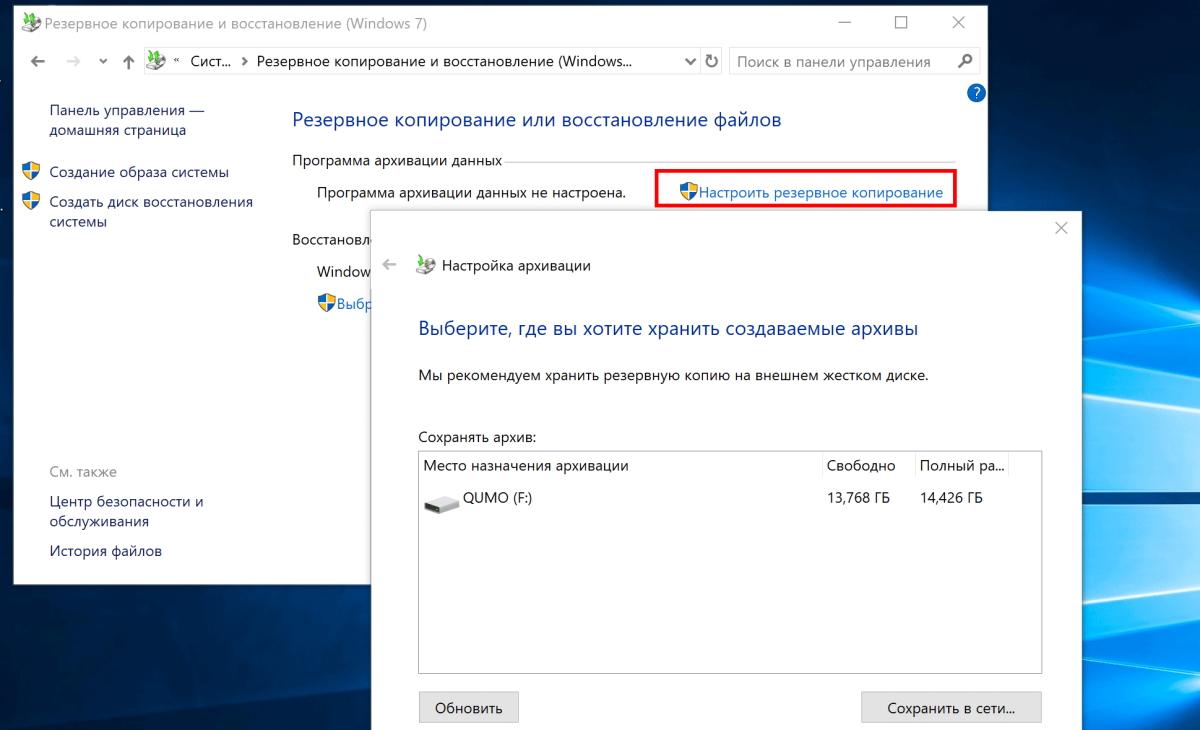 - выбрать накопитель, на котором будет храниться резервная копия;