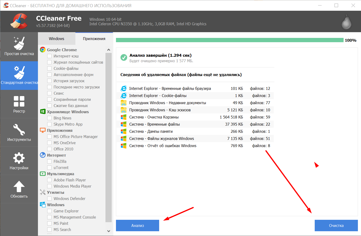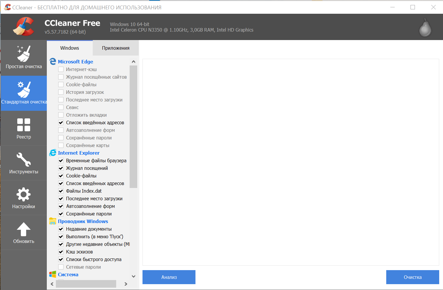 Стандартная очистка — поиск и удаление временных данных, файлового мусора, пустых папок. Чтобы приступить к оптимизации пространства на диске, выбираем приложения, файлы которых можно сканировать и удалять. Я оставлю значения по умолчанию, но проверяю, чтобы на вкладке «Приложения» не было отмечен Google Chrome. Это мой основной браузер – потерять от него настройки, пароли, автозаполнение и историю загрузок мне не хочется. Всё остальное можно удалять: «Анализ» — ждём окончания сканирования — «Очистка».