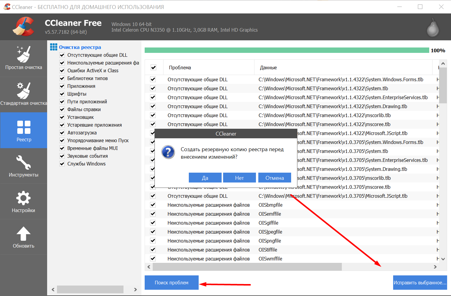 Очистка реестра — поиск и исправление ошибок в реестре Windows 10. Нажимаем «Поиск проблем», ждём завершения сканирования, на всякий случай сохраняем резервную копию и устраняем все неполадки.