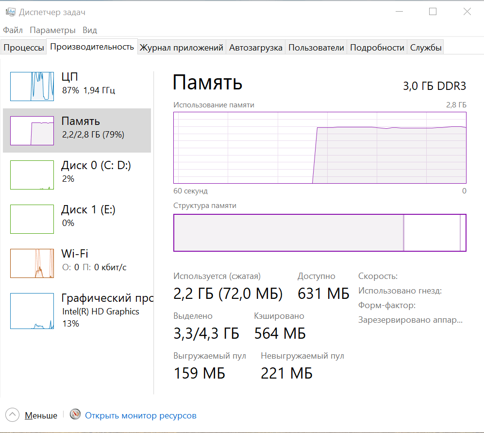 Мы видим, что 3 Гб уже маловато — память заполнена на 79%. Если запустить ещё какое-нибудь ресурсоёмкое приложение, то система начнёт жутко тормозить. Если пока нет возможности увеличить объём ОЗУ с помощью новых планок, то можно немного повысить производительность программными средствами.