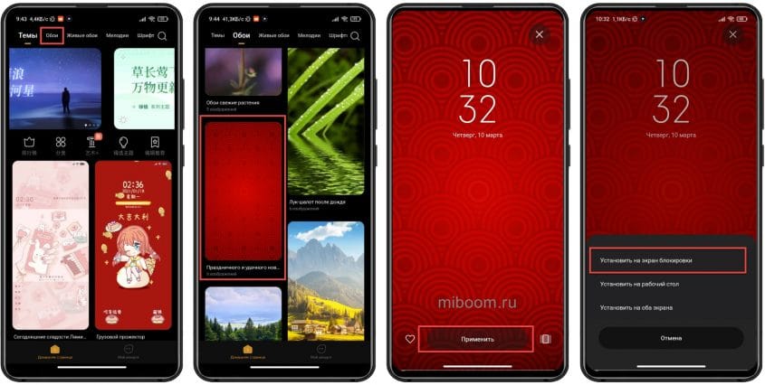 Ещё один вариант замены обоев – применить возможности штатного приложения «Темы». Причём для этого не обязательно менять весь стиль стандартной MIUI. Можно установить обои на экран блокировки, не выбирая конкретную тему оформления.