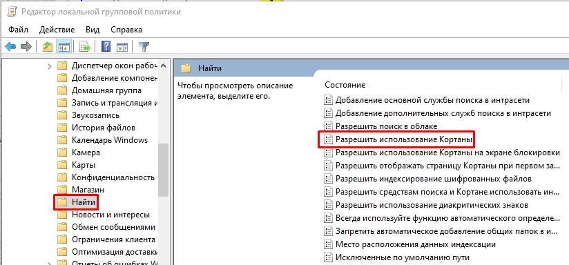 - Нажимаем на блок «Найти» и ищем элемент «Разрешить использование Кортаны».