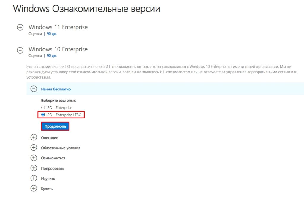 - Выбираем «ISO – Enterprise LTSC». Жмем «Продолжить».