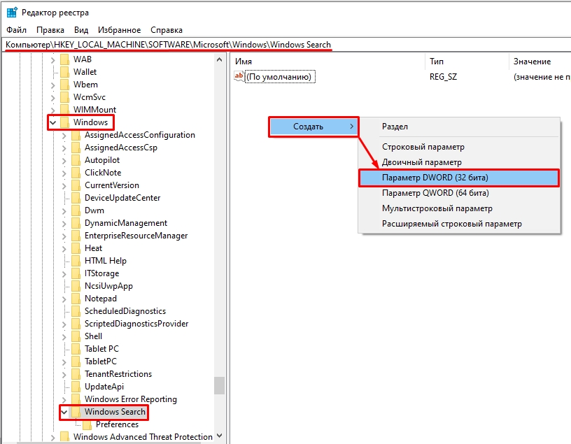 - если папки «Поиск Windows» нет, щелкните правой кнопкой мыши папку «Windows», выберите «Создать» -> «Раздел» и назовите ее «Поиск Windows“: