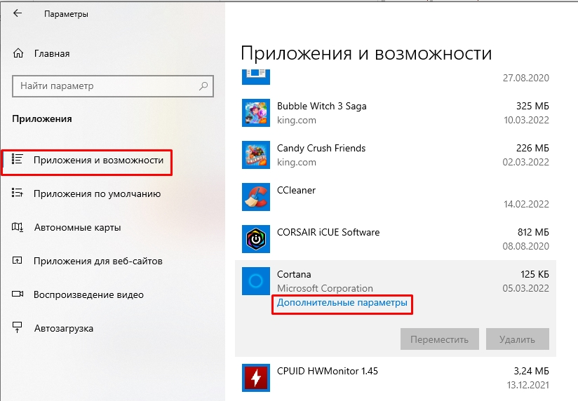 - Переходим в «Приложения и возможности», находим «Cortana» и заходим в «Дополнительные параметры». Заметьте, что кнопка «Удалить» – неактивна.