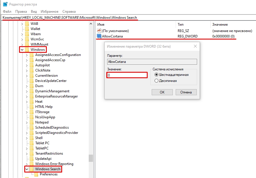 Чтобы снова включить (если вам когда-нибудь понадобится) Кортану, измените значение в AllowCortana с 0 на 1.
