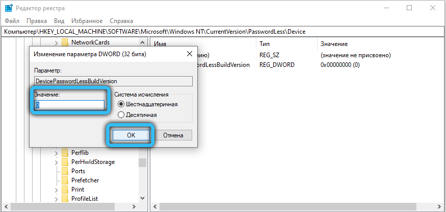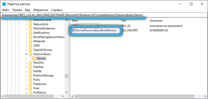 Если в списке параметров значится DevicePasswordLessBuildVersion, кликаем по нему и изменяем значение на 0 (скорее всего, там стоит 2, то есть Windows Hello включено).