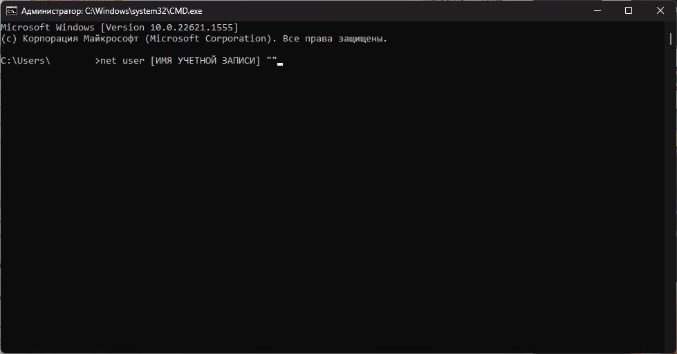 «»»» в конце команды — это не опечатка в команде. В пустых кавычках должен находиться пароль от учетной записи пользователя. Если оставить кавычки пустыми, Windows поймет, что пароля нет — она перестанет запрашивать его при входе в систему.