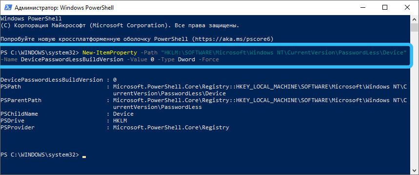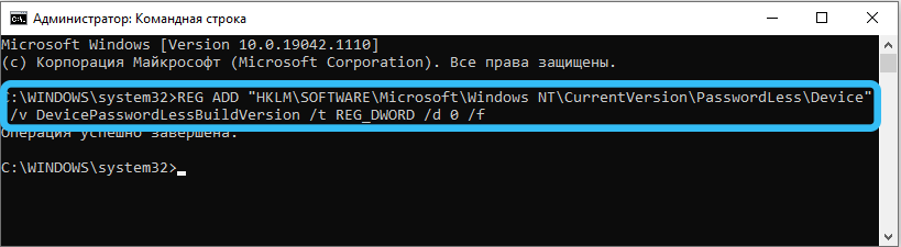 - вставьте в консоль команду reg ADD «HKLM\SOFTWARE\Microsoft\Windows NT\CurrentVersion\PasswordLess\Device» /v DevicePasswordLessBuildVersion /t REG_DWORD /d 0 /f и нажмите ENTER;