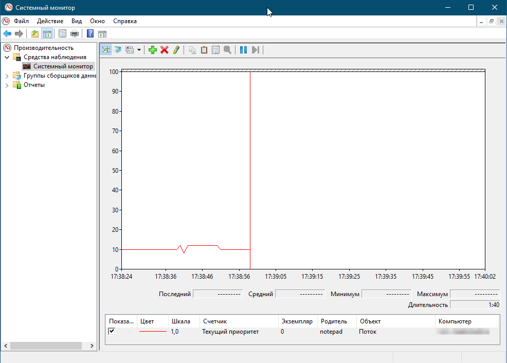 - Как только вы щелкните мышкой по блокноту, то заметите в Системном мониторе, что приоритет у потока «Блокнот» поднялся до 12, если свернуть блокнот то приоритет вновь упадет до 10.