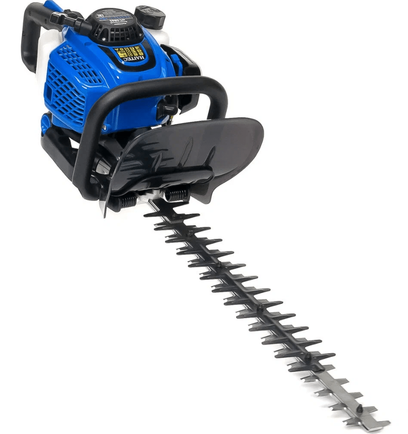Задняя рукоятка поворотная, с фиксацией под углом 90 градусов. Такая конструкция снижает нагрузку на кисти при обработке боковой части живой изгороди. Длинное полотно ножа упрощает доступ к удаленным местам, а экран из ударопрочного пластика защищает руки от получения травм. Бак изготовлен из полупрозрачного полимера для контроля над уровнем топлива.