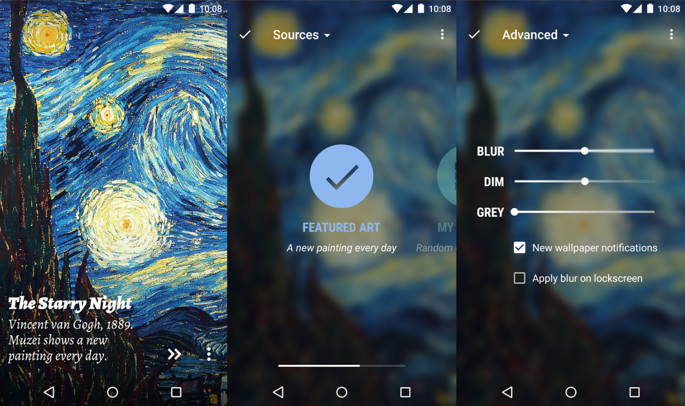 Вероятно, одно из лучших приложений для обоев для любителей классического искусства, Muzei обновляет ваш дом и блокирует экраны каждый день известными работами таких художников, как Винсент Ван Гог, Леонардо да Винчи, Пабло Пикассо, Клод Моне, Поль Сеззан и другие. Приложение также предлагает эффекты размытия и затемнения, чтобы держать ваши значки и виджеты в центре внимания. Вы можете дважды нажать на обои, чтобы вручную изменить эффект размытия как на экране блокировки, так и на главном экране. Вы также можете изменить интервал, после которого Muzei загрузит обои на ваш телефон. Лучшая часть? Вы также можете выбрать изображения со своего телефона в качестве фона.