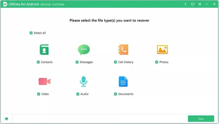 Как только устройство будет подключено, приложение начнет сканирование и покажет вам различные типы файлов, которые вы можете восстановить. Выберите файлы, которые вы хотите получить, и нажмите «Start»Кнопку.