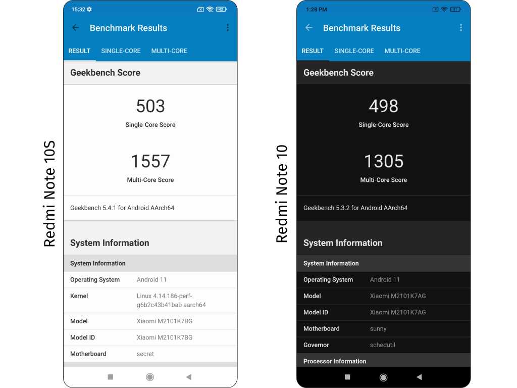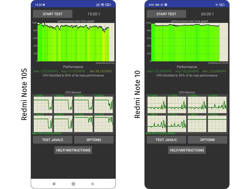 Судя по скриншотам, Редми Ноут 10 чуть лучше справляется в стрессовых ситуациях, но Ноут 10С имеет большую вычислительную мощность в мультиядерном режиме. Второй отличительной чертой является объем оперативной памяти: 4 или 6 ГБ у модели Note 10 против 6 или 8 ГБ у старшего брата.