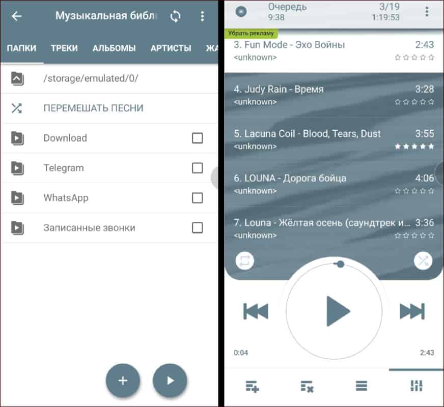 Ещё один из самых лучших проигрывателей для смартфонов на базе Android. На главном окне данной бесплатной утилиты пользователь может обнаружить многообразие традиционных закладок с основным контентом. Поиск выполнять можно как вручную, так и в режиме файлового менеджера. В левой части экрана мы видим специальную шторку, за которой можно отыскать меню. Предусматривает автоматический таймер отключения для тех, кто хочет засыпать под свои любимые треки.